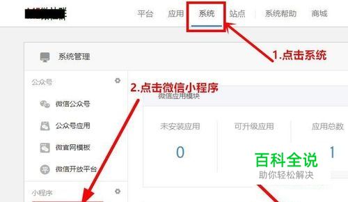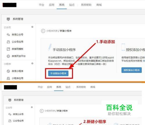 1.点击顶部导航栏菜单“系统” 2.点击左侧栏菜单“小程序” 3.点击主栏中“添加小程序” 如下图所示
