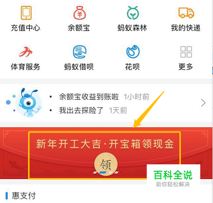 如下图所示,打开支付宝APP以后会在页面中间的活动窗口看到一个"开宝箱领红包"链接,点击进入以后一共有三个活动可领,分别是交电费、抢票以及抢优酷会员;