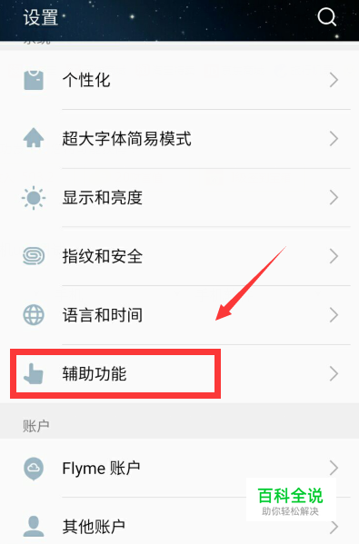 进入设置后,下滑,找到辅助功能,并且点击进入 【注明】如文字表达,不能理解,请查看图片