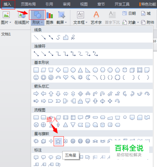在WPS文字文档中,选择插入--形状,选择一个五角星,然后按住SHIFT键加鼠标左键,在文档中画一个五角星。