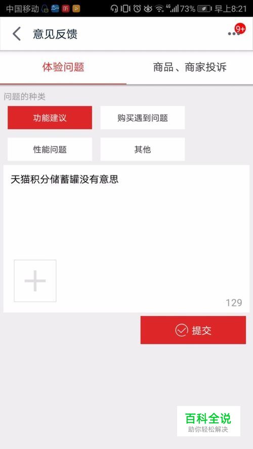 选择问题的种类后,输入问题的内容,还可以点击左下角的加号添加图片,总字数要控制在129字以内,接着点击右下角的提交。