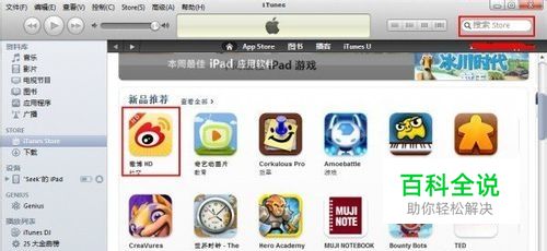2、当iTunes Store打开后,选择一款软件或者游戏,也可以在右上角的搜索框里输入你所需要的软件,小编以最近比较热门的软件新浪微博 HD举例说明,点击“微博 HD”进入软件详情页。