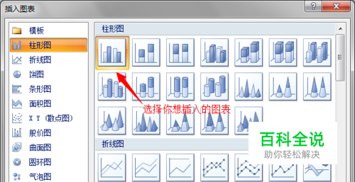 点击“图表”后会弹出一个窗口,在这个窗口里,选择你要插入图表的类型,我们这里以红标指导处为例,最后点击确定即可,如下图: