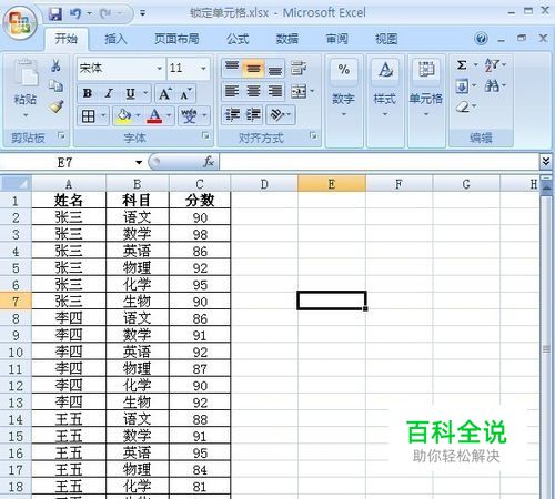 示例表格内容如下图,现需锁定分数一列,防止误操作:删除或修改该列数据