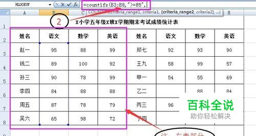 继续补全countifs公式“=COUNTIFS(B3:B8,">=85",C3:C8,">=85",”,“C3:C8,">=85"”这部分的含义是在左表部分的数学成绩区内统计成绩优秀学生的个数。
