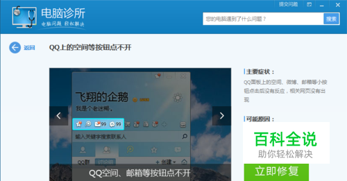 在腾讯电脑管家的电脑门诊中,我们可以根据我们电脑遇到的问题,选择相应的修复按钮进行一键修复,如QQ空间无法正常显示点击进去修复即可。