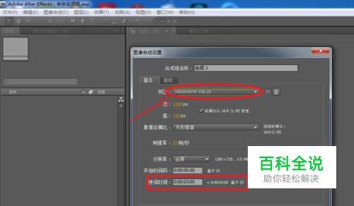 在我们打开软件后直接通过“Ctrl+N”快捷键,创建新的合成组。 注:将合成组的预置设为:HDV/HDTV 720 (持续时间为:3秒)