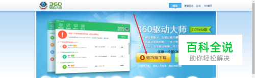 第一步,我们先从网上下载驱动软件,笔者这里以360驱动大师为例。打开官方网站之后,点击“轻巧版下载”或“网卡版下载”任意一个均可以,因为我们这时还有网络。