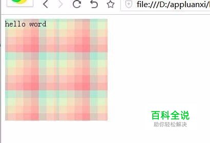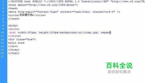 附上源码 <body> <style> .box{ border:1px solid #093; width:200px; height:200px; background:url(timg.jpg) no-repeat;} </style> <div class="box"> hello word </div> </body>
