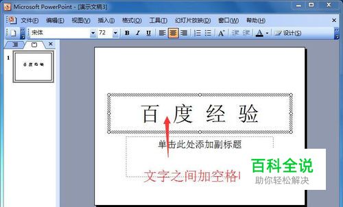 首先打开PPT,我们输入要设置动画的文字。这里在文字之间要插入空格哦,否则字号变大后会重叠的。