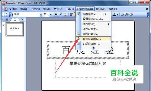 选中文字,依次单击“幻灯片放映”--“自定义动画…”,如图所示。