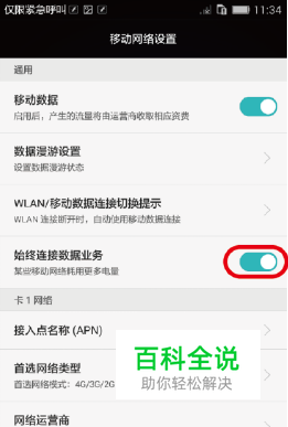 打开” 始终连接数据业务”开关,可设置手机屏幕关闭后始终连接网络数据业务,如关闭该功能,当屏幕关闭30分钟后,则不再访问网络数据业务,屏幕点亮后自动恢复数据业务连接。