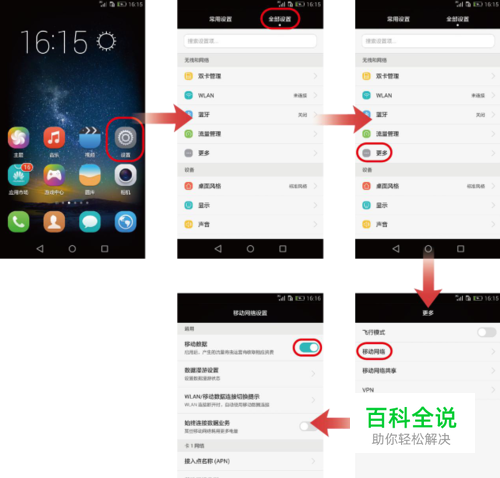 在主屏幕点击“ 设置”,切换到” 全部设置”页签,在” 无线和网络”区域点击” 更多”>“ 移动网络”,然后打开” 移动数据”开关,即可开启数据业务。