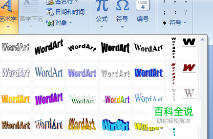 首选我们选择插入,下面一排选择艺术字,这个时候我们就发现,出现了很多不同式样的漂亮的艺术字体,来供我们选择。