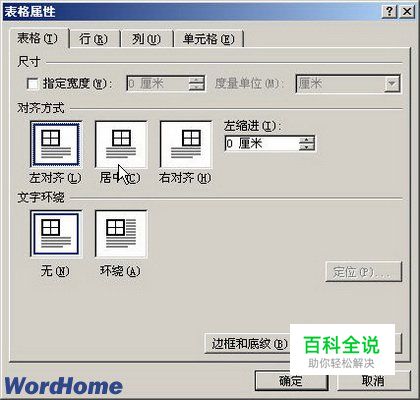 第2步,打开“表格属性”对话框,在“表格”选项卡中根据实际需要选择“对齐方式”区域的对齐方式选项,如“左对齐”、“居中”或“右对齐”选项。如果选择“左对齐”选项,可以设置“左缩进”数值(与段落缩进的作用相同)。设置完毕单击“确定”按钮,如图2009021302所示。图2009021302 设置表格对齐方式