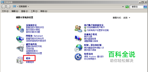 第二步:打开【控制面板】界面后,如下图所示,我们在界面中找到【程序(卸载程序)】,注意我们点击【程序】两字,而不点击【卸载程序】四字。