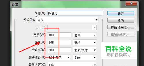 打开photoshop,点击文件新建一个图层,或者是按ctrl+n,尺寸使用毫米,高148mm,宽100mm,点击确定