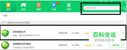 硬件安装完成后,我们点击打开360软件管家,在360软件管家首页上方的搜索框内搜索360免费软件,在弹出的下拉菜单里我们点击下载360免费wifi。