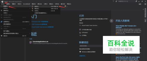 启动Visual Studio 2017软件,在弹出的“Visual Studio 2017主窗口”中,点击菜单栏上的“文件->新建->项目”(或使用快捷键Ctrl + Shift + N)创建一个新的开发项目;