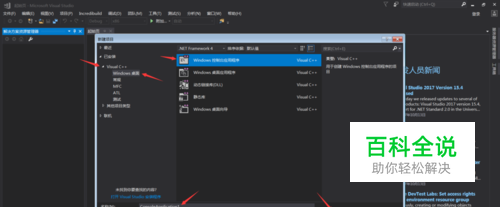 在弹出的“新建项目窗口”中,选择” Visual C++树形列表”下的” Windows桌面”(注意:如果没有,请参考引用的“Visual Studio 2017安装教程”安装缺失的组件),然后在右侧列表中,选中“Windows控制台应用程序”。可以根据需要在窗口下方输入项目名称、解决方案名称,指定项目的存储位置。配置完毕后,点击窗口中的“确定按钮”创建项目;
