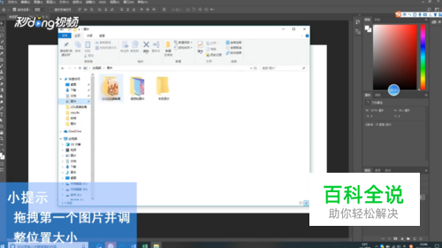 用移动工具将第一个图片拖拽到蓝白色的背景中,调整位置和大小。