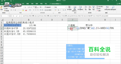 选中G3单元格,输入提示框内的公式,即可得出相应的度分秒格式的经纬度。