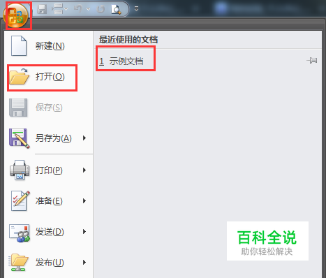 【打开示例文档】 双击桌面快捷键运行word程序,点击”office“按钮,单击”打开“命令,在最近使用文档下找到“示例文档”,鼠标左键单击打开“示例文档”。
