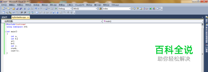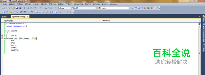 调试过程中你可以这样查看各个变量的值。将鼠标放在你想要知道其值的变量上,比如这边的c变量,程序就会自动提示此时值为多少。这样便用你了解调试过程中每时每刻变量的值是多少,如下图所示。