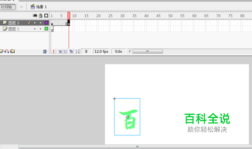 右键单击文字“百”,从下拉菜单中选择转换为元件选项,将其转换为影片剪辑元件,在1帧处设置alpha为30%,在8帧处插入关键帧,并设置alpha为100%