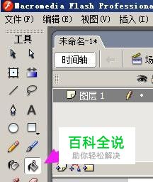 然后,在舞台左侧的工具箱中点“颜料桶工具”;光标显一个颜料桶的形状;