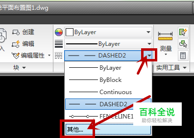打开cad后,如图所示,在项目栏中找到线段部分点击图示中的小黑三角号,然后在下拉界面中选择“其他”一项