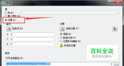 在打开的保存块窗口中,首先将源选项设置为“ 对象”。