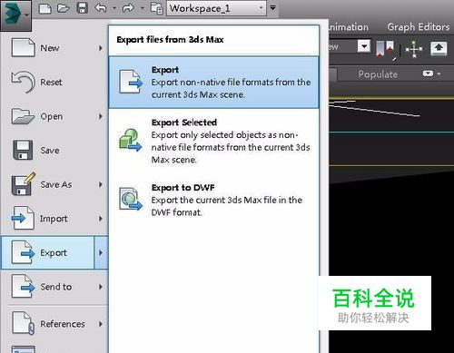 点击max图标上的三角,然后选择export---》export(导出全部)、select(导出选择)