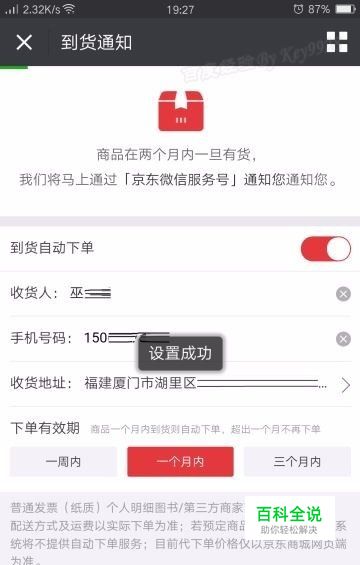 最后点击“到货帮我自动下单”,此时显示“设置成功”的提示: