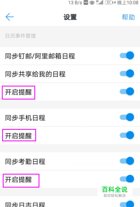 【日历设置】小拇指开启之后,提醒全部都是开着的,如图。