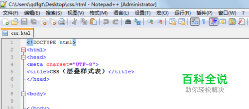输入以下内容: <!DOCTYPE html> <html> <head> <meta charset="UTF-8"> <title>CSS(层叠样式表)</title> </head> <body> </body> </html>