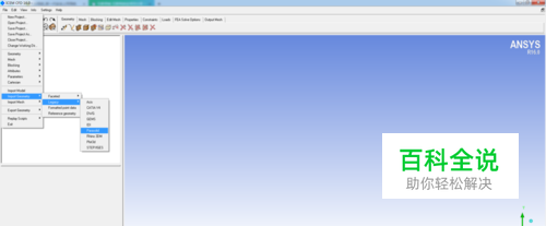 本文使用的几何模型由三维制图软件Pro/E绘制,保存为副本Parasolid(*.x_t)格式后导入ICEM软件,导入后调整单位及显示状态,导入过程及结果如下所示。