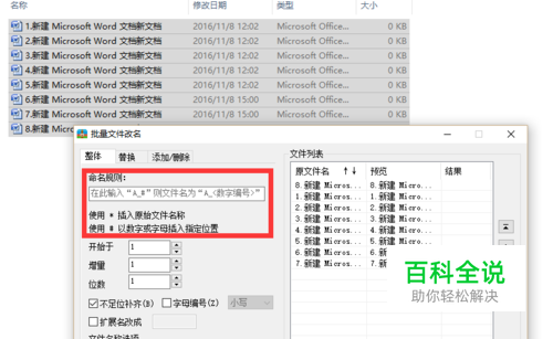 看到有“命名规则”那栏,“#”代表数字或字母,“*”代表原始文件名称,如果文件原始名称为“新文档”,那么输入“#*”,预览文件名为“1新文档”“2新文档”......