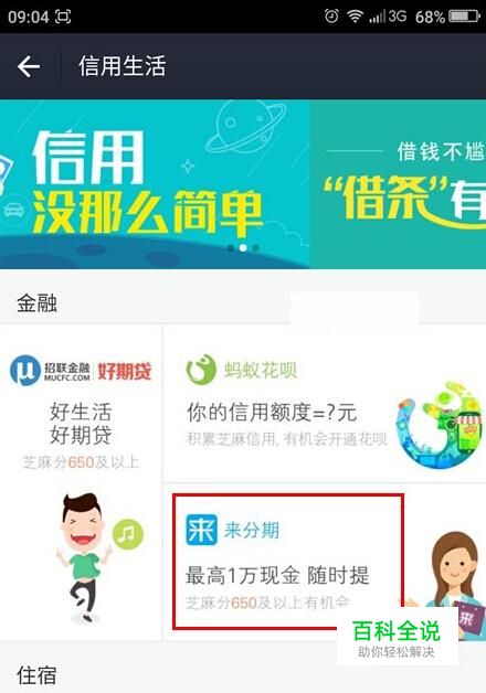 打开手机上的支付宝APP,点击“芝麻信用”——“信用生活”按钮,在信用生活界面点击“来分期”图标。