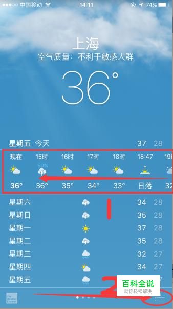 点击进入了天气之后,我们这就来到了城市的天气详情,我们可以在当天的时间表界面里往左滑动(如下图所示)来查看当天每个时间段的天气。在下面我们还能看到一周之内的天气情况。再在这个界面的右下角找到三横的标志(如下图所示),点击