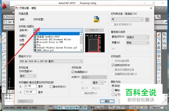 点击确定后,系统自动弹出"页面设置 模型“对话框。在打印机名称复选框中选择打印机。
