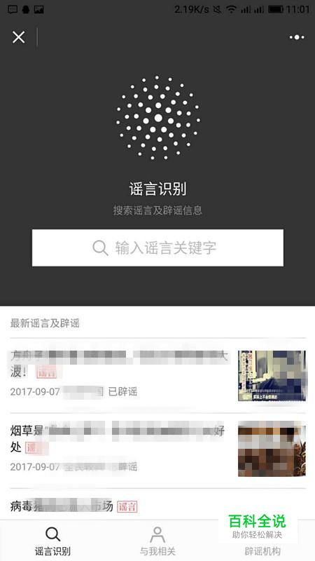 跳转到“微信辟谣小助手”的主页面;我们可以看到正中间有个白色横框框,白色框上面写着“谣言识别”,我们可以输入相关的字或者词或者句子段落等等,进行搜索;白色框框下面是近期的谣言文章的信息;