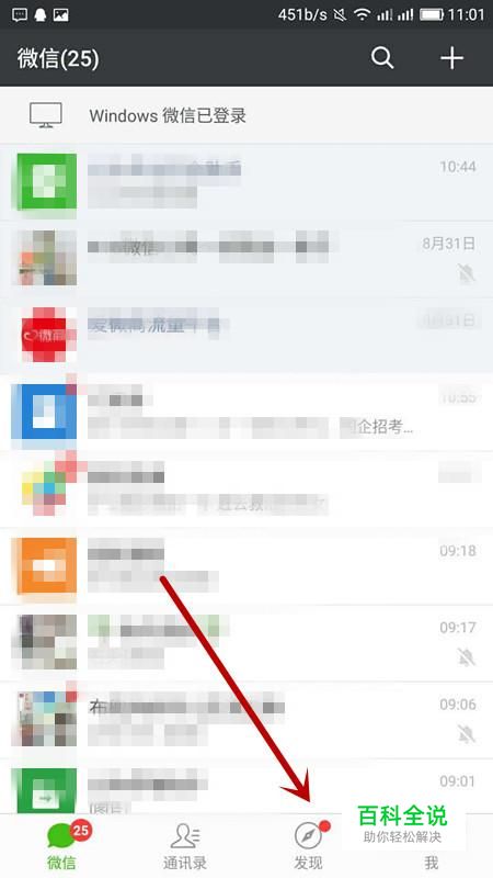 打开手机微信,点击微信首页面底部的第三个功能选项——“发现”;
