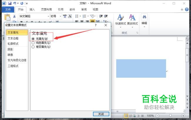 系统自动进入设置文本效果格式框。在文本填充复选框中找到无填充选项,用鼠标选择无填充选项。