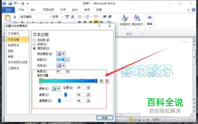 在文本填充复选框中找到渐变光圈,亮度,透明度,使用鼠标拖动滑块改变渐变光圈,亮度,透明度。调节至自己感觉合适。