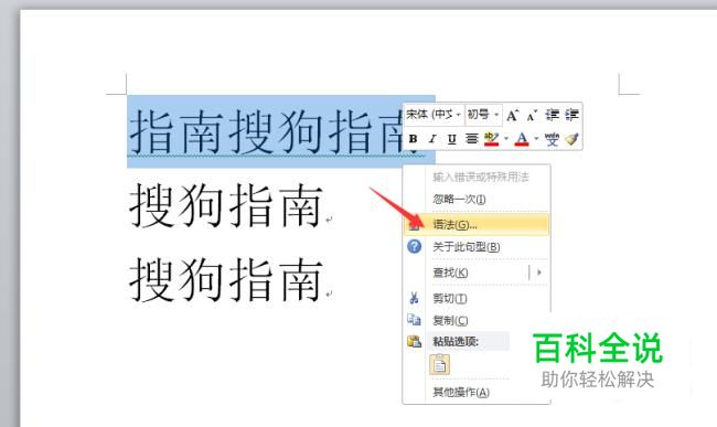 选中有波浪线的文本,右键单击,选中菜单中的”语法“。