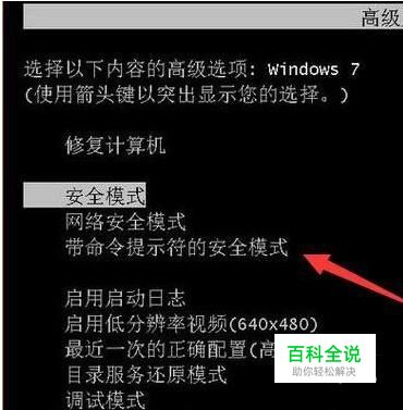 然后进入到“Windows高级启动选项界面”,用键盘上下键选中“带命令提示符的安全模式”,最后按Enter键即可