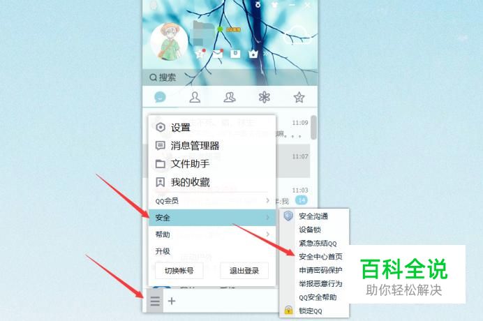 首先在电脑上登陆QQ,并按照下图箭头所指位置找到“安全中心首页”选项,并点击进入。