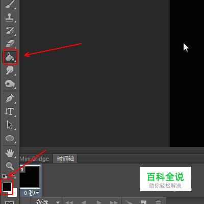 点选工具面板上的“油漆桶工具”(前景色设置为“黑色”)并按下“Ctrl+A”快捷键,点击画布将其背景涂成黑色。