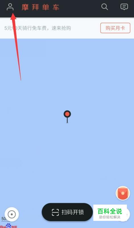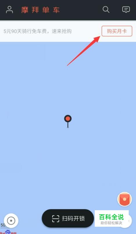 首先我们先打开摩拜共享单车客户端,打开之后会看到在面板顶部会有一个5月90天骑行免费的活动,此时我们单击“购买月卡”按钮。